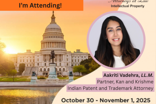 Kan and Krishme to Attend AIPLA 2025 Annual Meeting in Washington, D.C. Kan and Krishme is pleased to announce that Aakriti Vadehra, Partner, will represent the Firm at the AIPLA 2025 Annual Meeting, to be held in Washington, D.C. from October 30 to November 1, 2025, at the Gaylord National Resort and Convention Center. Hosted […]