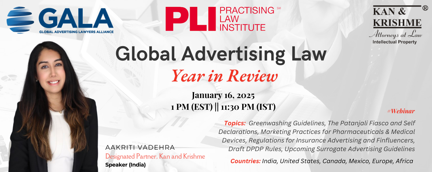 Kan and Krishme is proud to announce that Ms. Aakriti Vadehra, Designated Partner at the firm, will be speaking at the much-anticipated Global Advertising Law: Year in Review webinar, hosted by the Practising Law Institute (PLI).